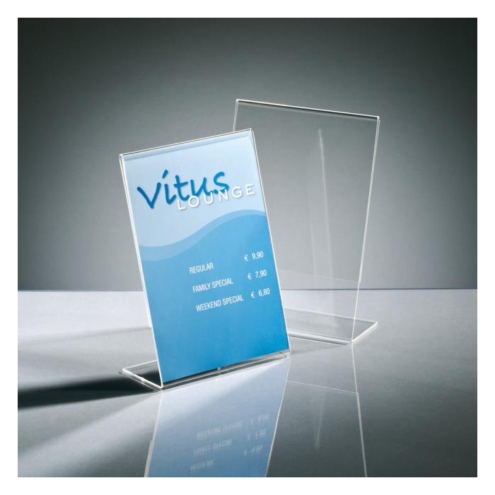 Univerzálny stojan odolný voči UV žiareniu v naklonenej verzii. Vhodný na výstavy, veľtrhy, ponukové listy, jedálne lístky a propagačné materiály. Vyrobený z kvalitného číreho akrylu, stabilný a pevný. Formát A4.