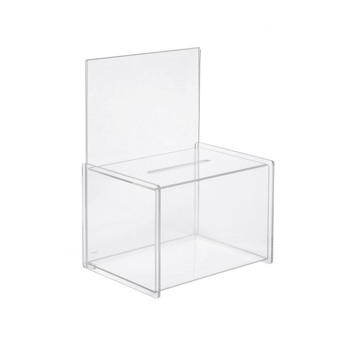 Priehľadný box z kvalitného akrylu ideálne pre zber vizitiek, súťažných kupónov, vstupných formulárov a mnoho ďalšieho. Mimoriadne všestranný pri veľtrhoch alebo pre reklamné kampane. Súčasťou je vkladací panel na popis pre listy formátu A4. Výrobca poskytuje záruku 25 rokov na odolnosť akrylu voči UV žiareniu. Rozmery 225 × 310 × 170 mm. Farba číra.