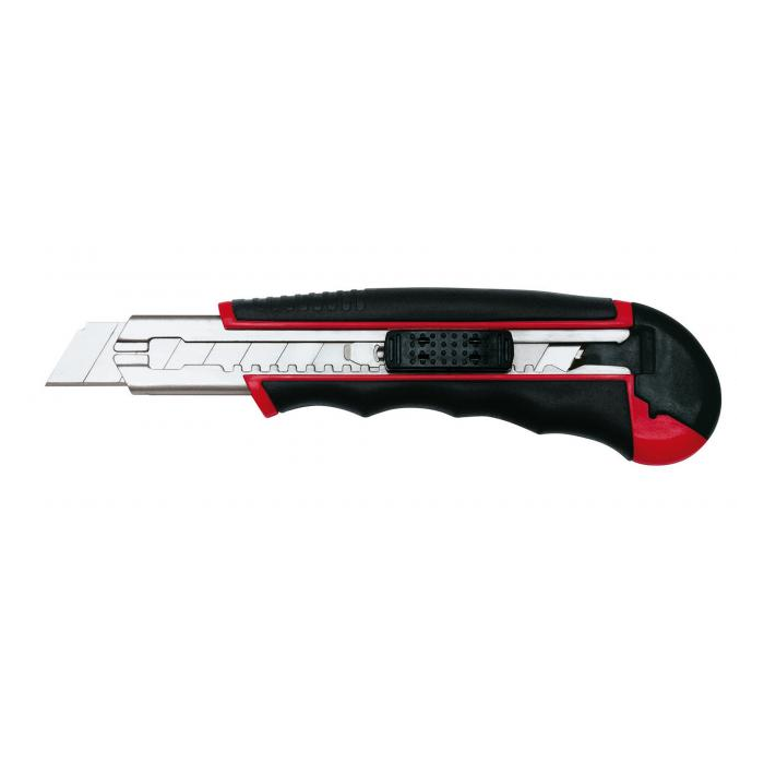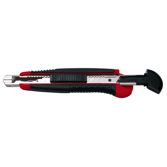 Robustný profesionálny rezač s gumeným vrúbkovaným úchytom, pevným celokovovým vedením noža a automatickým uzamknutím noža. Po vytiahnutí opotrebovaného noža sa zasunutím bežca nainštaluje z integrovaného zásobníka automaticky nôž nový. Šírka čepele 18 mm. V balení 6 náhradných čepiel. Schválené inštitútom TÜV. Farba čierna/ červená. Šírka čepele: 18 mm