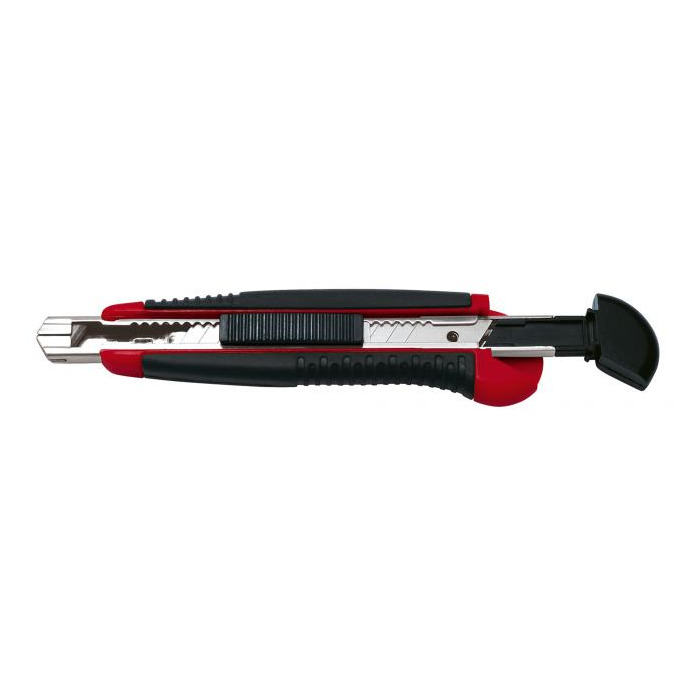 Robustný profesionálny rezač s gumeným vrúbkovaným úchytom, pevným celokovovým vedením noža a automatickým uzamknutím noža. Po vytiahnutí opotrebovaného noža sa zasunutím bežca nainštaluje z integrovaného zásobníka automaticky nôž nový. Šírka čepele 9 mm. V balení 6 náhradných čepiel. Schválené inštitútom TÜV. Farba čierna/červená.