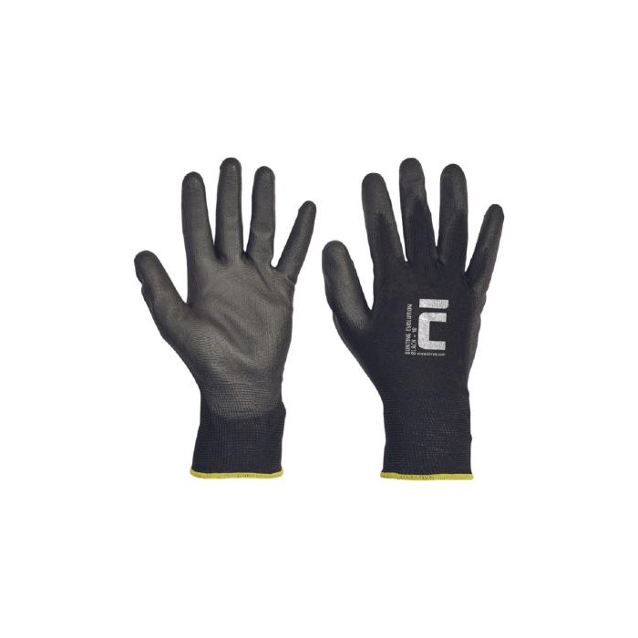 Pletené bezešvé polyesterové rukavice, s tenkou vrstvou polyuretanu v dlani a na prstech a pružnou manžetou.