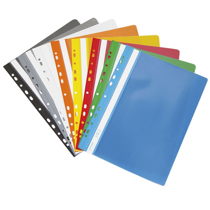 Obal s eurodierovaním z kvalitného polypropylénu na uloženie dierovaných dokumentov do formátu A4. Predná strana priehľadná lesklá, biely papierový zasúvací štítok pozdĺž chrbta. Rozmery 310 × 235 mm.