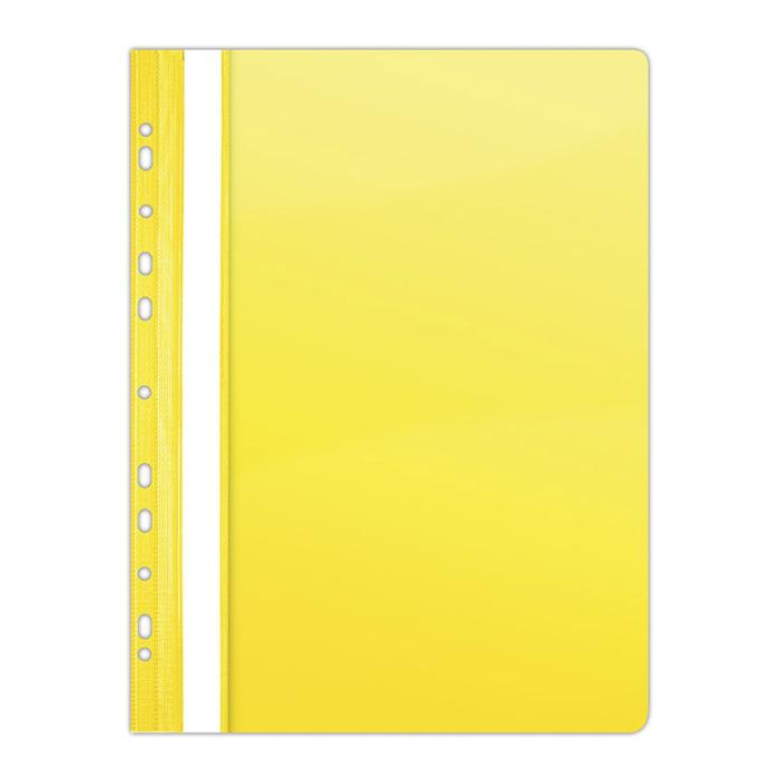 Obal s eurodierovaním z kvalitného polypropylénu na uloženie dierovaných dokumentov do formátu A4. Predná strana priehľadná lesklá, biely papierový zasúvací štítok pozdĺž chrbta. Rozmery 310 × 235 mm. Balenie 10 ks. Formát: A4 Farba: žltá