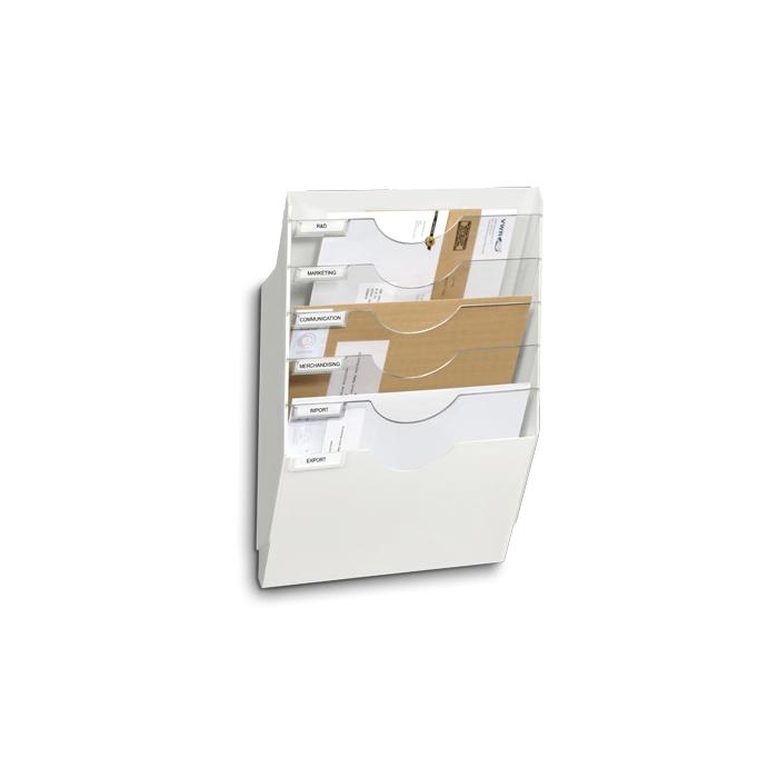 Atraktívna sada s piatimi vyberateľnými odkladačmi pre dokumenty formátov do 24 × 32 cm. Vynikajúca viditeľnosť obrazovaného materiálu, materiál nárazuvzdorný recyklovaný polystyrén. Rozmery (š × v × h) 346 × 536 × 14 mm. Farba biela.