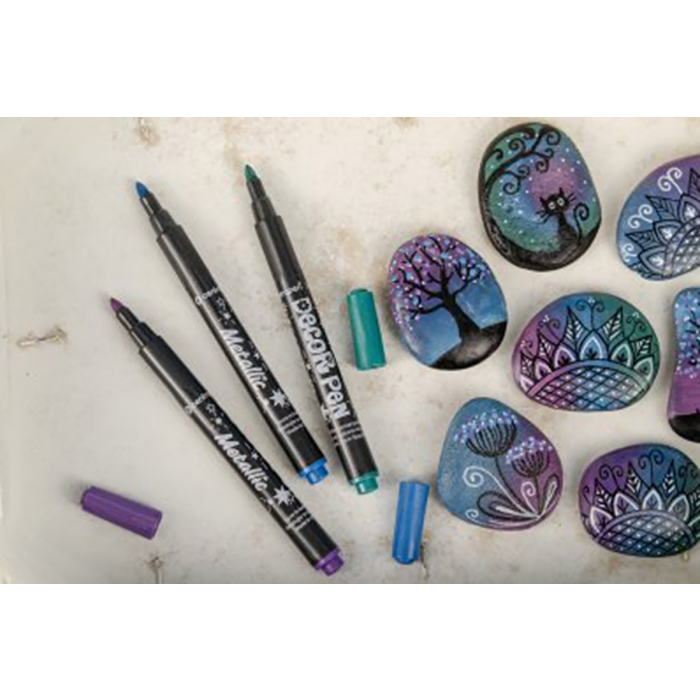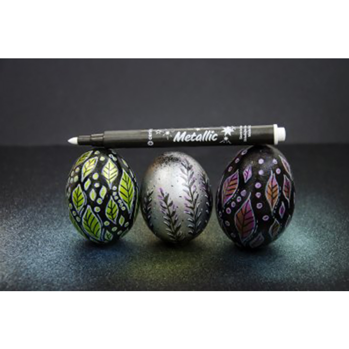 Sada 8 metalických odtieňov a 1 biely popisovač určený k dekorácii rôznych materiálov (lakový papier, kov, sklo, fólia, keramika, kraslica, kameň). Svetlostály pigmentový atrament na vodnej báze. Stopa písma je výrazne sýta, permanentná, svetlostála. Po dokonalom zaschnutí (min. 4 hod.) sa stopa stáva odolnou voči oteru a na poréznych povrchoch i vode. Z neporéznych materiálov možno zmyť vodou so saponátmi. Šírka stopy 1,5 mm. Skladujte vo vodorovnej polohe.