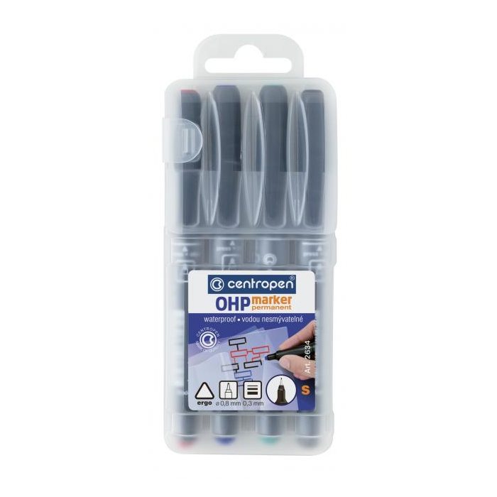Permanentné popisovače na alkoholovej báze s ergo držaním na popisovanie transparentných fólií do spätných projektorov, ale tiež na plastické hmoty, sklo a pod. Väčšie balenie 10 ks v jednej farbe. Hrot okrúhly, šírka stopy 0,3 - 0,4 mm. Farba mix.