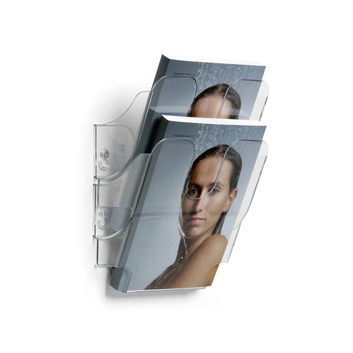 Nástenný stojan na prospekty FLEXIPLUS s 2 priehradkami na informácie vo formáte A5, s plniacim objemom 23 mm. Rozmery: 180 x 250 x 105 mm (Š x V x H). Ideálny ako držiak letákov a stojan na noviny v recepčných a čakacích priestoroch, na veľtrhoch alebo v kancelárii. Vyrobené v Nemecku