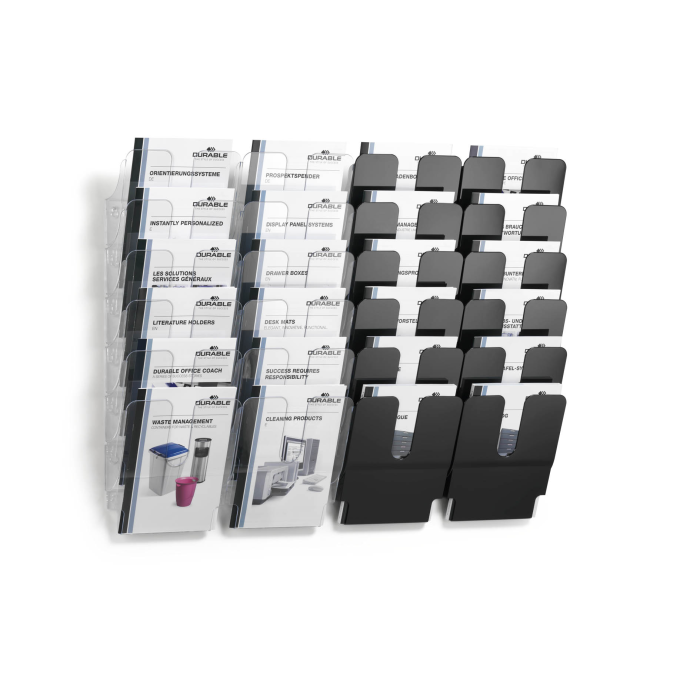 Sada stojanov na brožúry Flexiplus so 6 priehradkami na informácie vo formáte A4. Priehradka s kapacitou 23 mm. Montáž sady na stenu. Rozmery: 247 x 1080 x 100 mm (Š x V x H). Ideálna na vystavenie letákov, novín a časopisov v recepciách a čakárňach, na veľtrhoch alebo v kancelárii. Vyrobené v Nemecku. Farba biela.