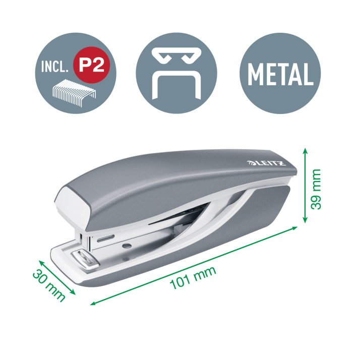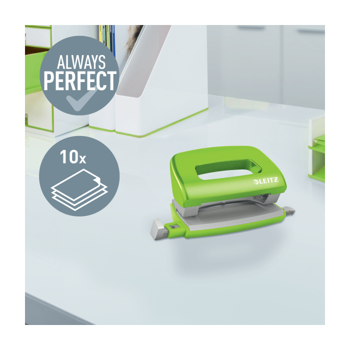 Minisúprava v moderných farbách. Malé a kompaktné rozmery. Kapacita 10 hárkov. Celokovová minizošívačka a dierovačka na použitie v kancelárii aj na cestách. Zošívačka s otvorením ramena o 180° na nástenkové zošívanie. Použite spinky Leitz Power Performance P2, č. 10, jedna škatuľka spiniek je súčasťou balenia. Dierovačka má príložník s kontrastnou potlačou jednotlivých formátov, rámček na jasné určenie formátu. Balenie v blistri. Farba zelená.