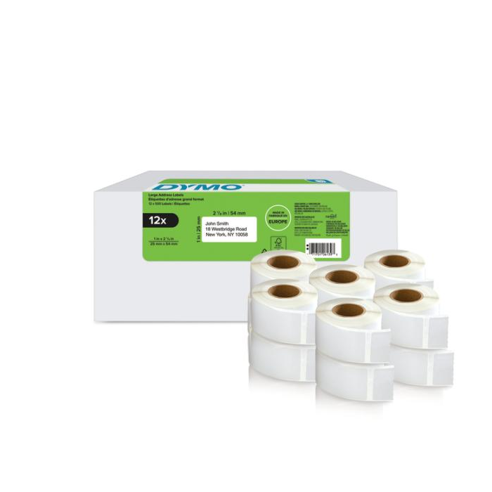Etikety do tlačiarní Dymo LabelWriter 450 a Labelwriter 450 Duo sú navinuté v rolke. Materiál papier.Farba etikiet biela. Farba: biela Rozmery: 54x25 mm Balenie: 12x500 ks