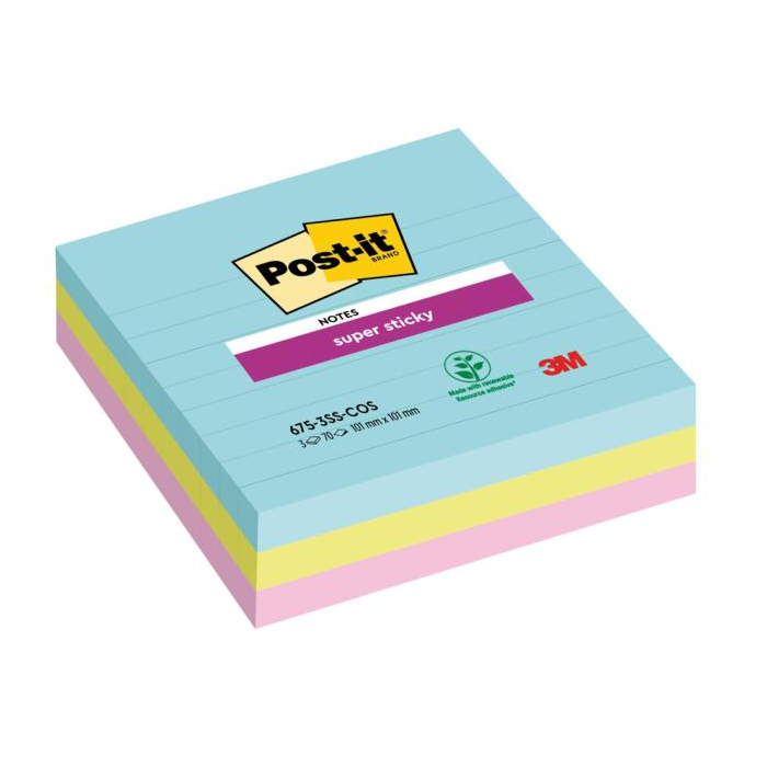 Bločky Post-it® Super Sticky™ so špeciálnym lepidlom, vďaka ktorému držia aj na nerovnom povrchu. Po odlepení nezanechávajú stopy po lepidle. Mix farieb. Rozmery 101 x 101 mm. Počet lístkov 3 x 70.
