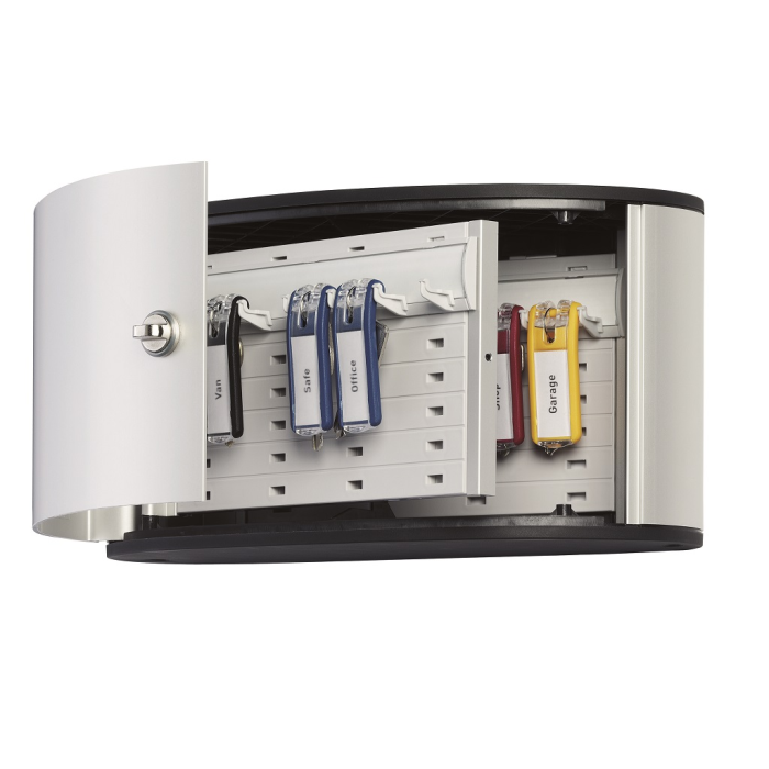 Malá skrinka na 12 kľúčov s dvierkami, otvárajúcimi sa z dôvodu lepšej obsluhy v 180° uhle, uzatváranie na západku. Optimálna do domácností a malých kancelárií. Jednoduchá montáž na stenu. Súčasťou balenia je montážna sada a 6 menoviek na kľúče v rôznych farbách. Rozmery (š×v×h) 302×160×118 mm. Farba strieborná.