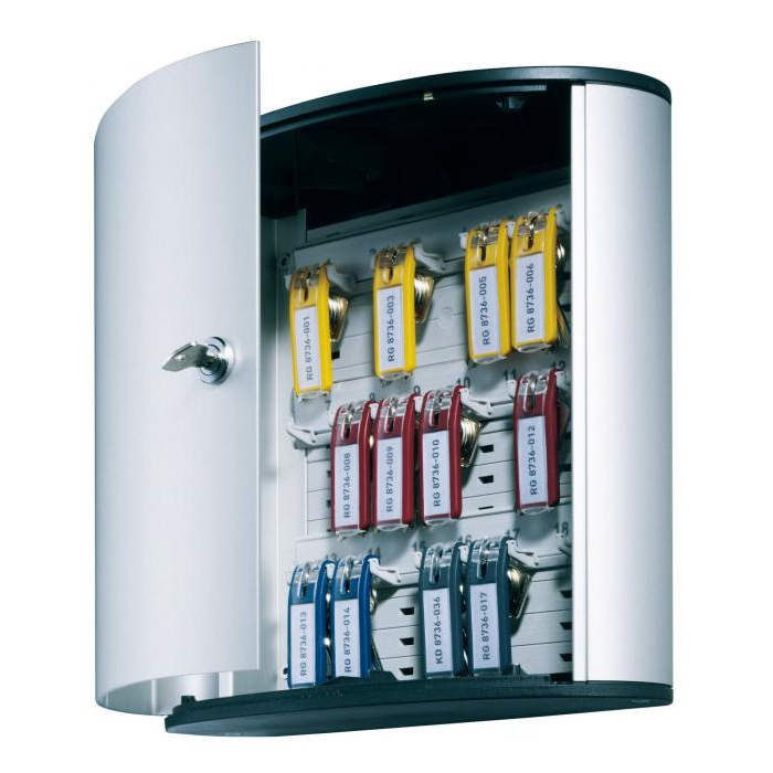 Skrinka na 18 kľúčov s dvierkami, otvárajúcimi sa z dôvodu lepšej obsluhy v 180° uhle. Jednoduchá montáž na stenu. Súčasťou balenia je montážna sada, 2 bezpečnostné kľúče a 6 menoviek na kľúče v rôznych farbách. Farba strieborná. Výška: 28 cm