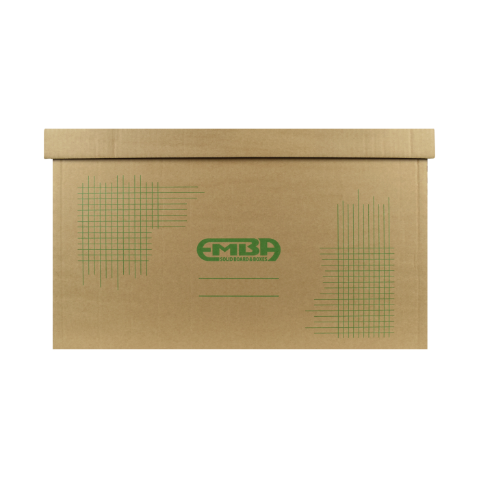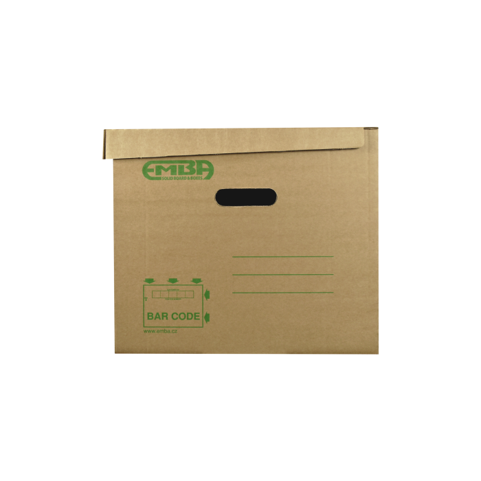 Sťahovací hnedý box s kvalitnou zelenou sieťotlačou vyrobený z recyklovateľnej hnedej vlnitej lepenky. Konštrukčné riešenie krabice umožňuje rýchly prístup k uloženým dokumentom alebo predmetom. Konštrukcia je spevnená zosilnením bočných stien. Maximálna nosnosť 100 kg. Rozmery 610 × 430 × 380 mm.