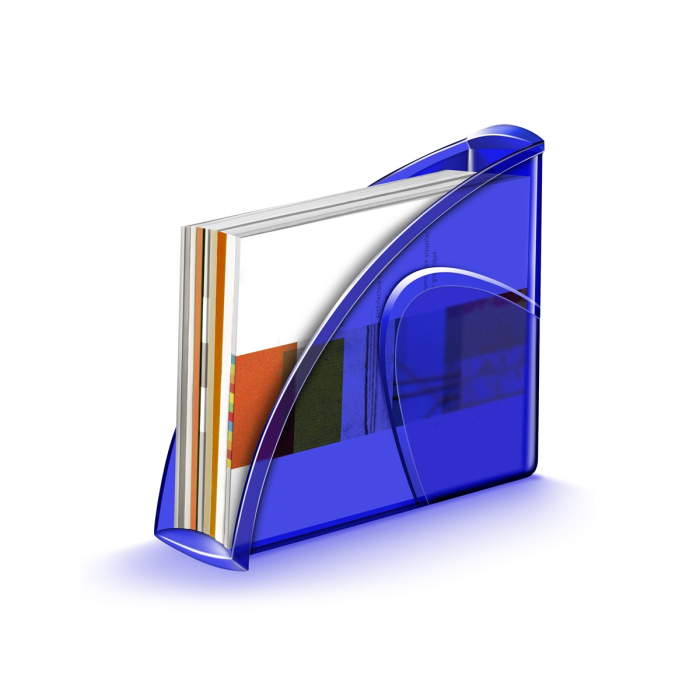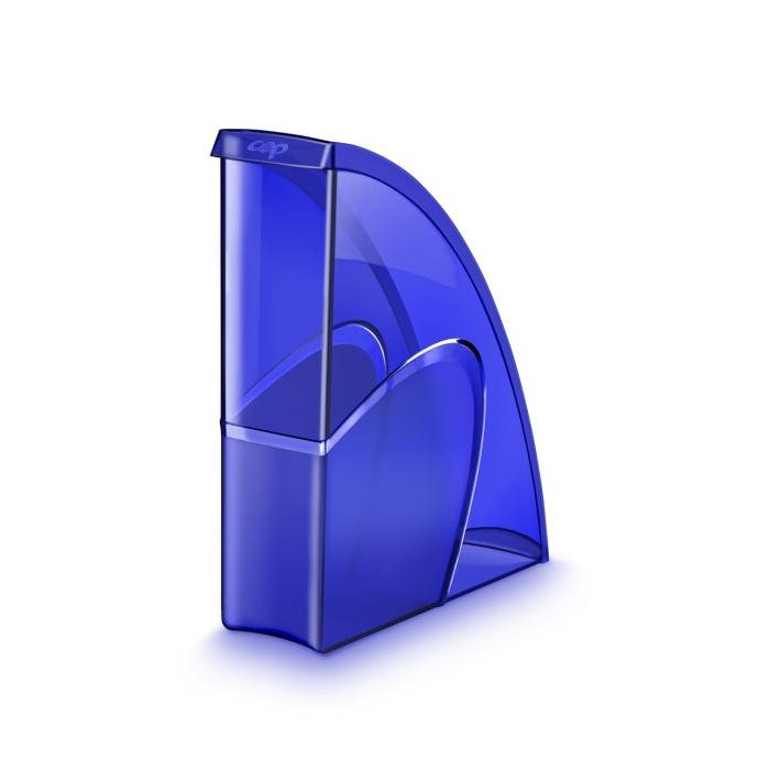 Stojan na časopisy s možnosťou vertikálneho alebo horizontálneho postavenia má elegantné línie, zvýraznené materiálom s kontrastným matným povrchom na hladkom pozadí. Vhodný na dokumenty do veľkosti 24 × 32 cm. Kapacita 700 listov (80 g / m²), rozmery 270 × 85 × 310 mm. Materiál 100% recyklovateľný vysokokvalitný plast. Väčšie balenie 10 ks. Farba transparentná modrá.