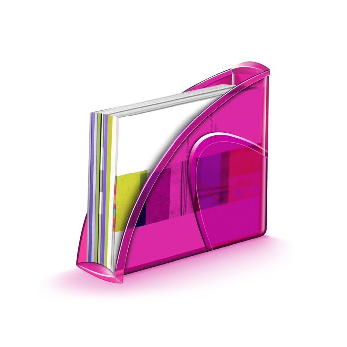 Stojan na časopisy s možnosťou vertikálneho alebo horizontálneho postavenia má elegantné línie, zvýraznené materiálom s kontrastným matným povrchom na hladkom pozadí. Vhodný na dokumenty do veľkosti 24 × 32 cm. Kapacita 700 listov (80 g / m²), rozmery 270 × 85 × 310 mm. Materiál 100% recyklovateľný vysokokvalitný plast. Väčšie balenie 10 ks. Farba transparentná ružová.