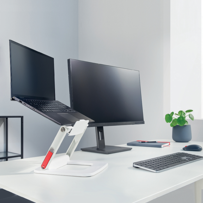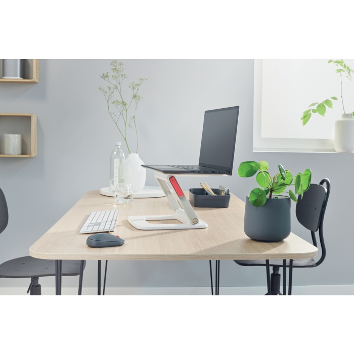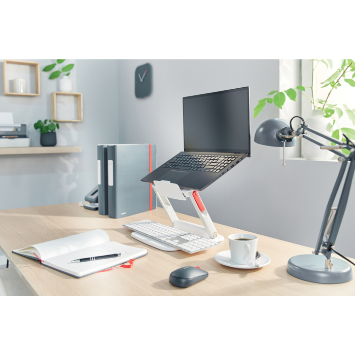 Viacuhlý stojan na notebook Leitz Ergo dvíha obrazovku notebooku do ideálnej ergonomickej výšky, čím zvyšuje pohodlie pri sledovaní a pomáha zlepšiť držanie tela. Rôzne kombinácie výšky a uhla vrátane horizontálneho nastavenia s malými rozmermi pre kompaktné stoly. Použitie stojana pod notebook tiež podporuje prúdenie vzduchu, čím sa zabraňuje prehrievaniu batérie notebooku a ďalších komponentov a notebook si tak udržuje vysokú úroveň výkonu.