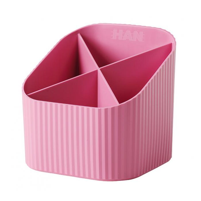Stojan so 4 priehradkami v modernom dizajne a trendových farbách. Materiál vysokokvalitný PP. Rozmery 111 × 121 × 106 mm. Farba ružová.