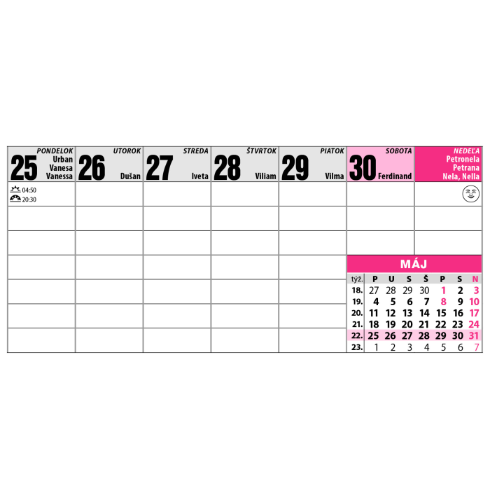 Tento týždenný stĺpcový kalendár ocenia najmä seniori a ľudia so zhoršeným zrakom. Veľké, ľahko čitateľné písmo zaručuje pohodlné používanie bez námahy. Obsahuje tabuľku prázdnin, slovenský menný kalendár a priestor na poznámky. Ideálny pomocník do domácnosti alebo kancelárie.