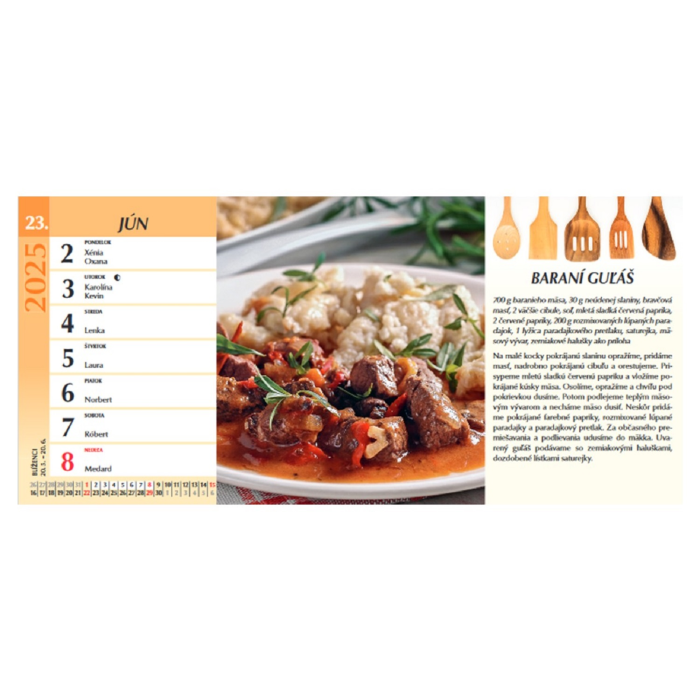 Stolový riadkový kalendár s chutnými inšpiráciami na varenie aj pečenie. Pestré zábery a prehľadné recepty Vám spríjemnia čas strávený v kuchyni.