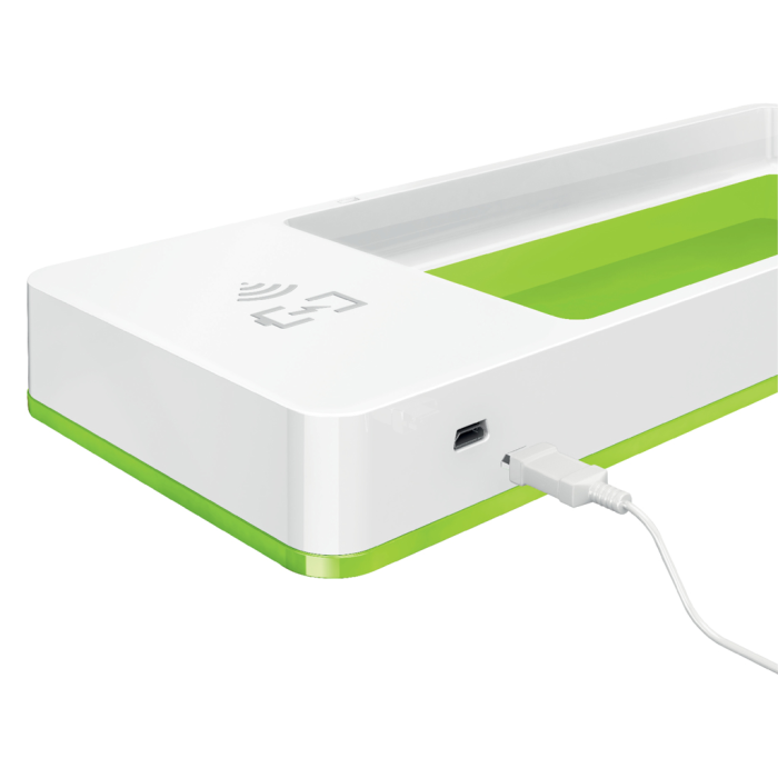 Výrazný moderný stolový organizér v prémiovej kvalite značky Leitz, v módnom dvojfarebnom vyhotovení a so štýlovým lesklým povrchom. Funkcia bezdrôtového nabíjania pre vždy plne nabitý telefón bez nutnosti pripájať káble.