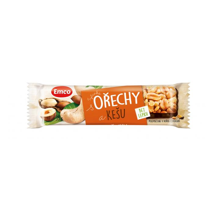Orechová tyčinka Emco s kešu vhodná na vaše cesty, či už do práce, školy alebo na výlet. Výrobok neobsahuje lepok, hrozienka a palmový tuk. Hmotnosť 35 g.