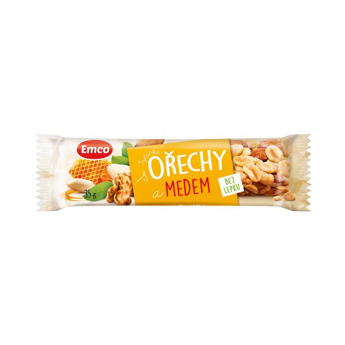 Skvelá orechová tyčinka Emco s medom, vhodná na vaše cesty, či už do práce, školy či na výlet. Neobsahuje lepok, hrozienka a palmový tuk. Hmotnosť 35 g.