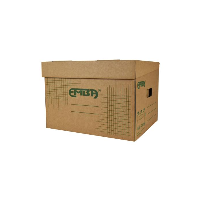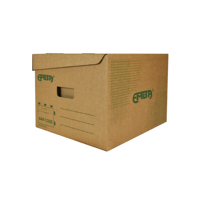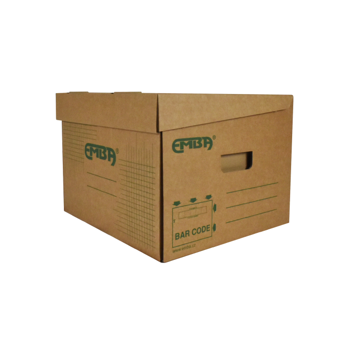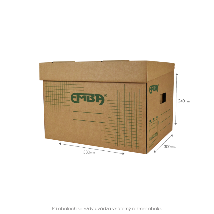 Úložná škatuľa s výklopným vrchnákom z hnedej vlnitej lepenky so zelenou potlačou. Určená na uloženie voľne vložených spisov formátu A4. Rozmery š330xd300xv240 mm.