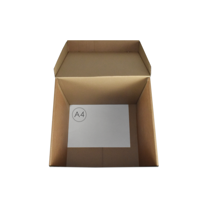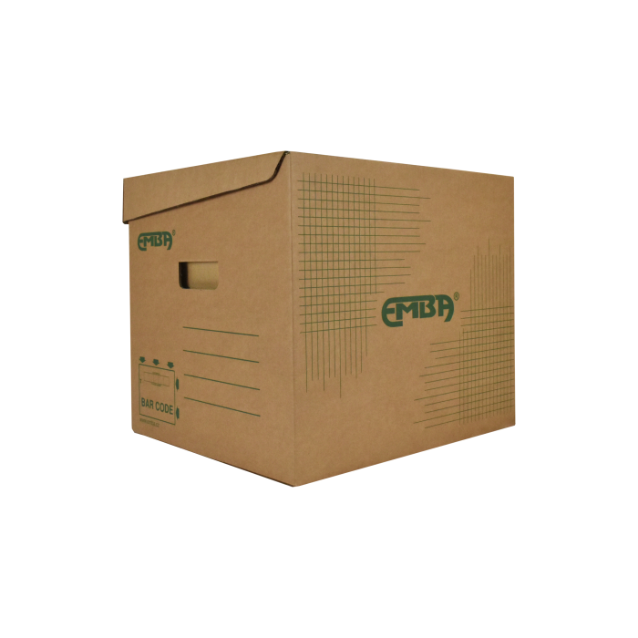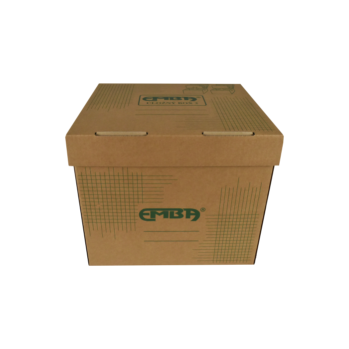 Úložná škatuľa vyrobená s výklopným vrchnákom z hnedej vlnitej lepenky. Určená na uloženie 4 ks zakladačov šírky chrbta 8 cm alebo archívnych boxov EMBA TYP I/75. Rozmery 330x300x295 mm.