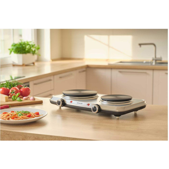 2 varné dosky s priemerom 18 a 15 cm Povrch z nehrdzavejúcej ocele Plynule regulovaný termostat Jednoduchá obsluha a čistenie Ochrana proti prehriatiu Ľahko prenosný Svetelný indikátor Protišmykové nožičky Vypínač ON/OFF Príkon: 2 250 W