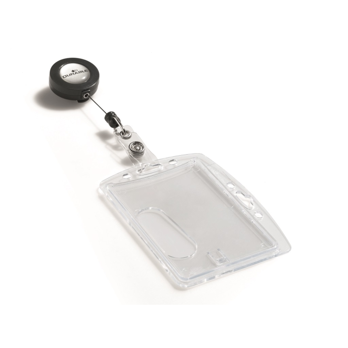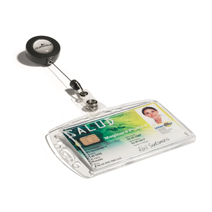 Visačka na jednu plastovú identifikačnú kartu z priehľadného plastu, ktorý chráni kartu pred poškodením. S otvorom na palec na rýchle a jednoduché vysunutie karty. Plastová visačka s výsuvným kotúčikom čiernej farby s kovovým klipom a možnosťou vysunutia do 80 cm. Balenie 10 ks.