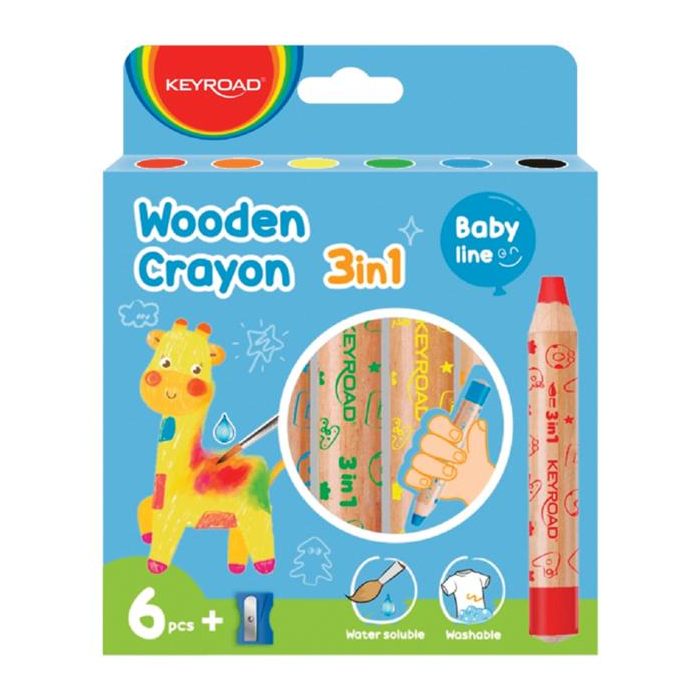 Voskové vodové pastelky v drevenom puzdre. Vysokokvalitné JUMBO pastelky na báze vosku a vodových farieb, ideálne pre malé deti. Funkcie: 3 v 1 voskové pastelky rozpustné vo vode, 6 kusov + strúhadlo.