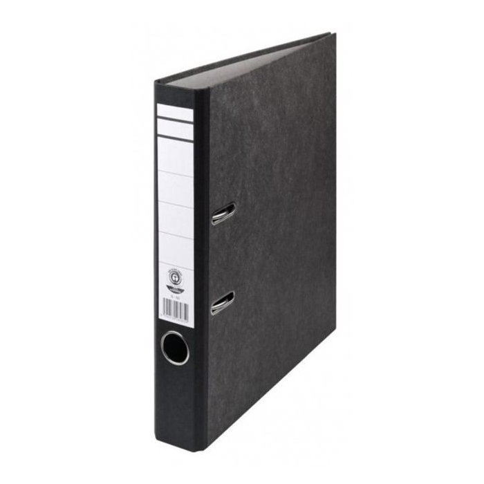 Zakladač so štruktúrovaným papierovým poťahom mramorového vzoru, formát A4. Vybavený kovovým prítlakom, chrbtovým krúžkom a nalepeným chrbtovým štítkom. Šírka chrbta 5 cm. Väčšie balenie: 25 ks. Farba čierna.