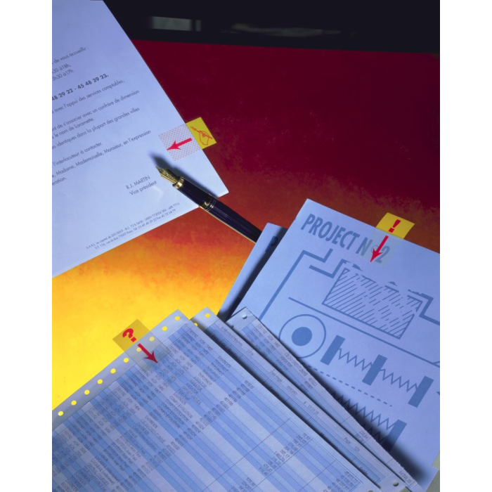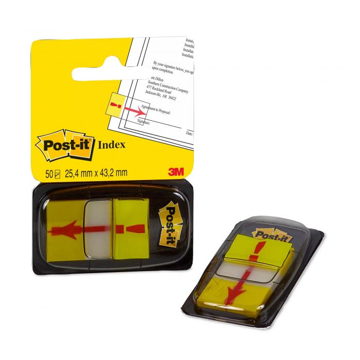 Priehľadná lepiaca časť a farebná časť na označenie. Prelepiteľné, znovunalepiteľné a popisovateľné. Rozmery záložky 25,4 × 43,2 mm. Farba žltá. Počet lístkov: 50.