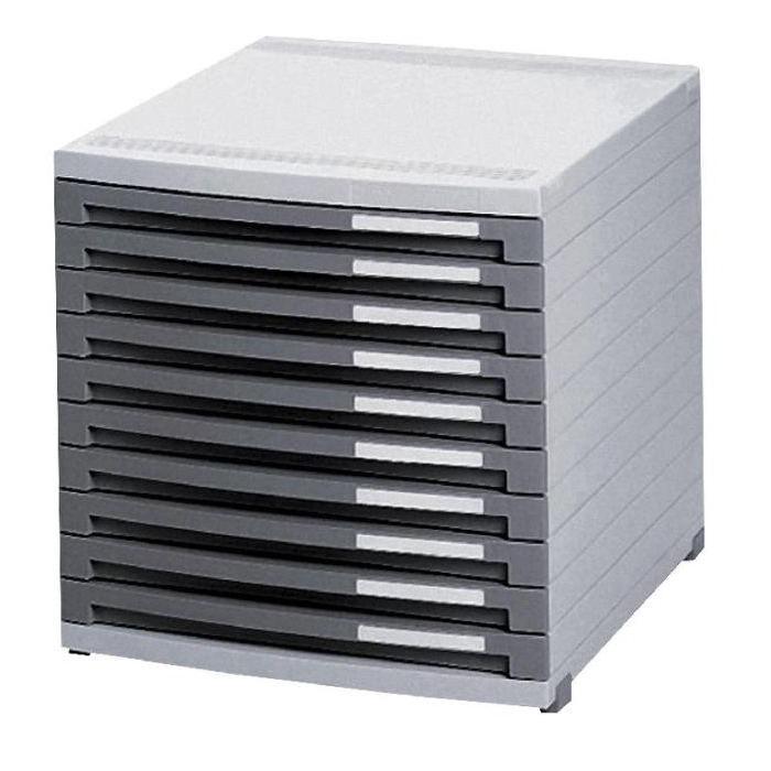 Box z modulárneho systému zásuvkových boxov s horizontálnym aj vertikálnym spájaním. Model s otvorenými zásuvkami (bez predného krytu) výšky 25 mm a zarážkou chrániacou zásuvky pred úplným vysunutím. Súčasťou sú identifikačné menovky na označenie zásuviek.Telo boxov vo svetlosivej farbe, zásuvky tmavosivé. Rozmery (š × v × h) 30 × 30,7 × 38,2 cm.