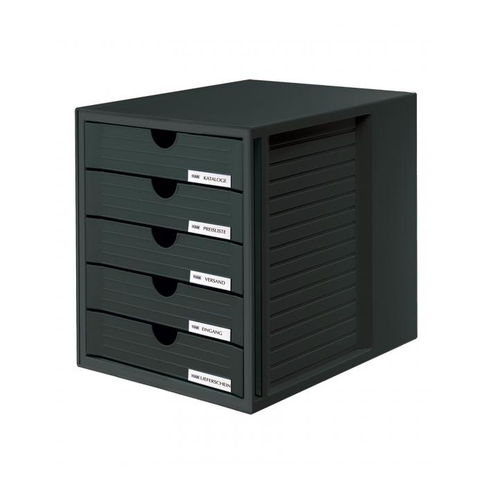 Plastový zásuvkový box s piatimi zatvorenými zásuvkami. Zmestí sa do ľubovoľnej police určenej pre zakladače, pretože výška boxu je totožná s výškou pákových zakladačov (275 × 330 × 320 mm). Farba boxu/zásuvky: čierna/čierna Rozmery: 275 x 330 x 320 mm