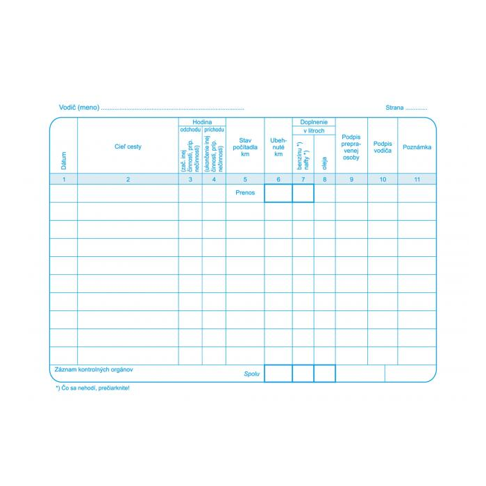 Dopravné tlačivo. Záznam o prevádzke vozidla osobnej dopravy, A5, blok, 100 listov.