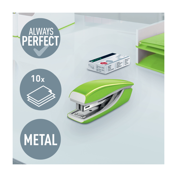 Malá zošívačka v moderných žiarivých farbách ideálna nielen do kancelárie, ale aj domov alebo na cesty. Vždy perfektné zošitie vďaka patentovanej technológii DIT. V kombinácii so spinkami Leitz Power Performance P2 (č. 10) dosiahnete vždy jednoduché a správne zošitie.Kapacita 10 hárkov. Vrecková zošívačka. Patentovaná technológia DIT na spoľahlivé zošívanie. Balenie v škatuľke, vrátane spiniek. Otvorením ramena o 180° je možné použiť nástenkové zošívanie (takrovanie). Farba zelená.