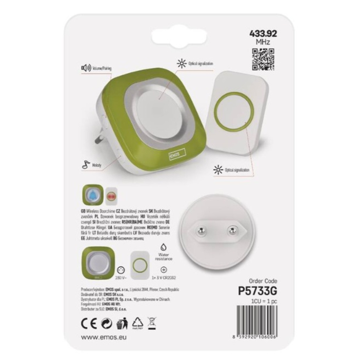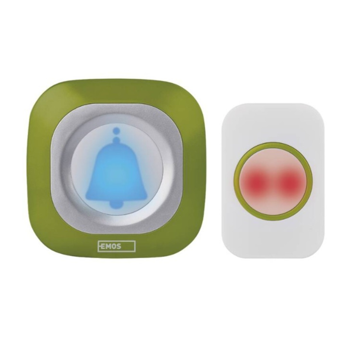 • vodeodolnosť • ochrana IP44 • napájanie tlačidla 3 V batériou CR2032 • napájanie hlavnej jednotky: zásuvka • optická signalizácia na tlačidle: áno • optická signalizácia na zvončeku: áno • maximálna hlasitosť zvonenia: 110 dB